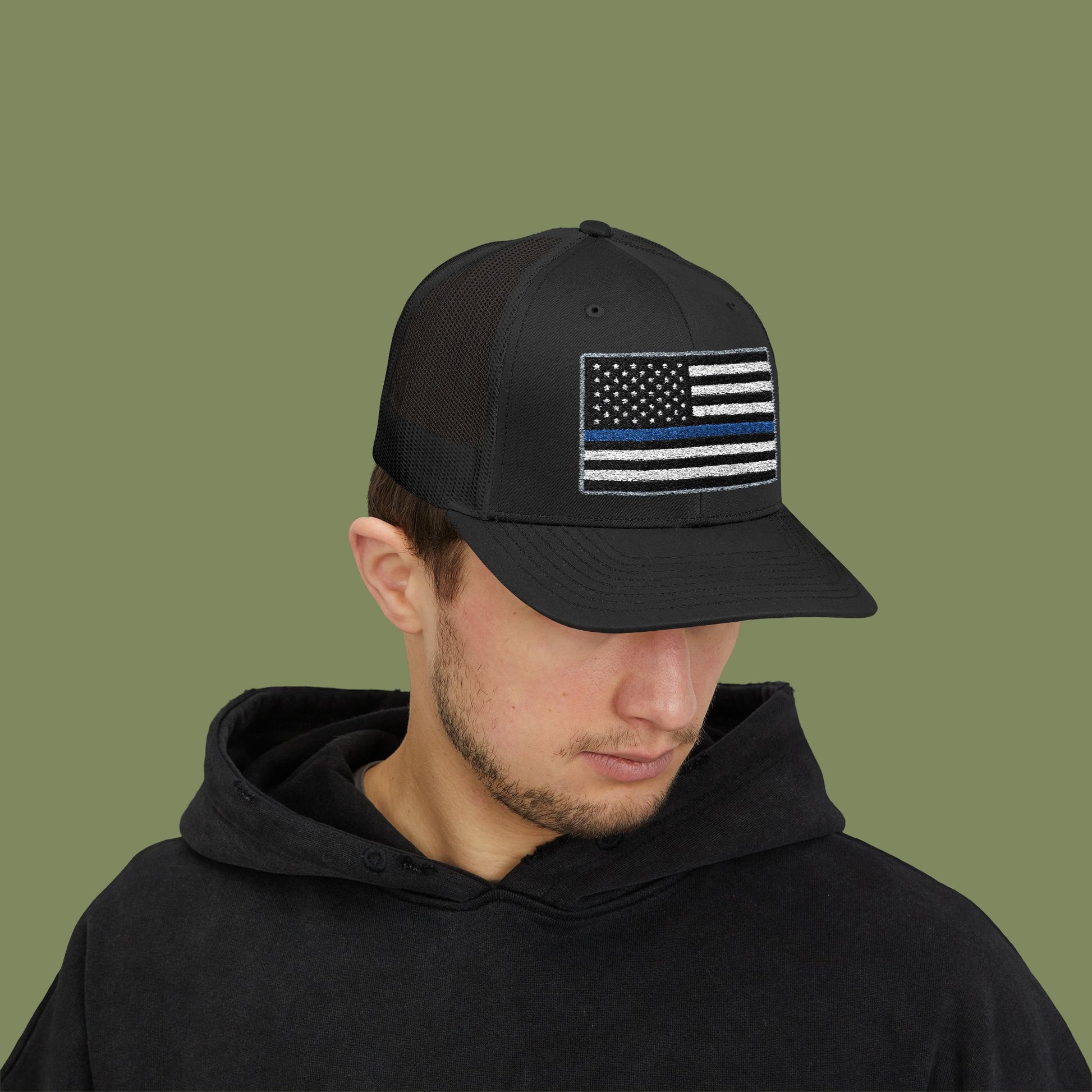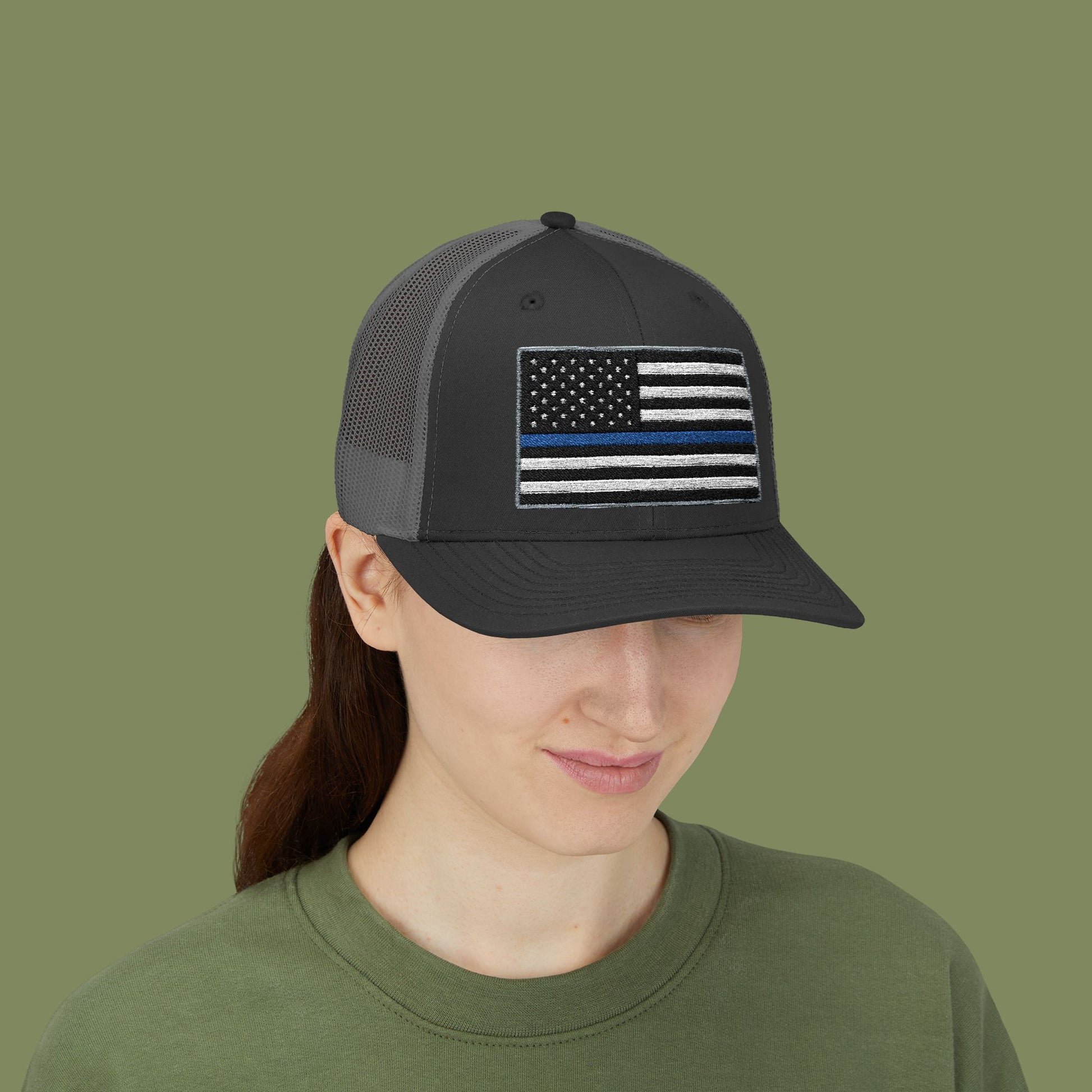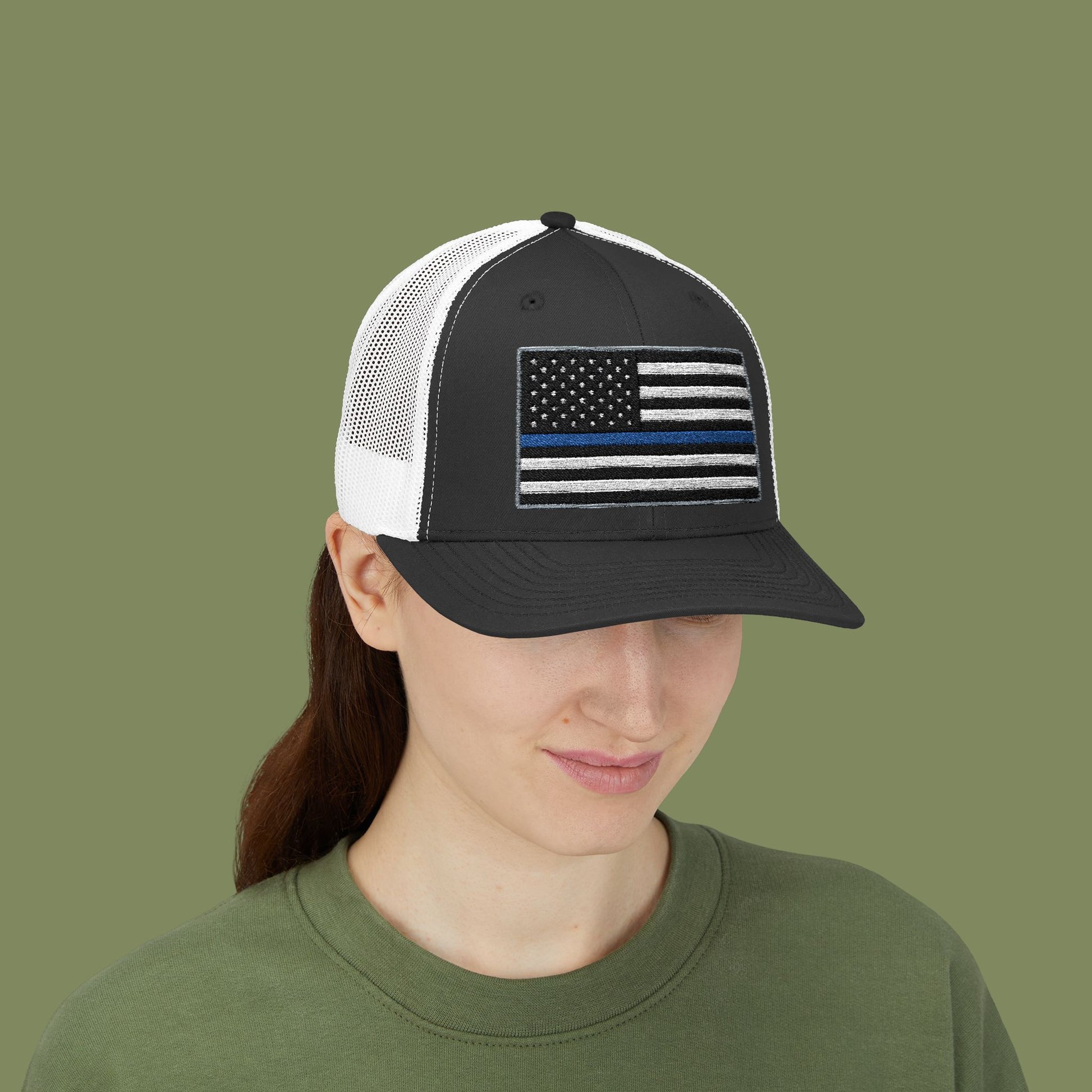 Honor service and sacrifice with this American-themed snapback trucker cap featuring a black embroidered United States outline with a Thin Blue Line detail. Perfect for outdoor enthusiasts and sports fans, this cap is designed for everyday wear and provides a casual, laid-back vibe. It makes a meaningful gift for those who support law enforcement, ideal for birthdays, Father’s Day, or holidays.
