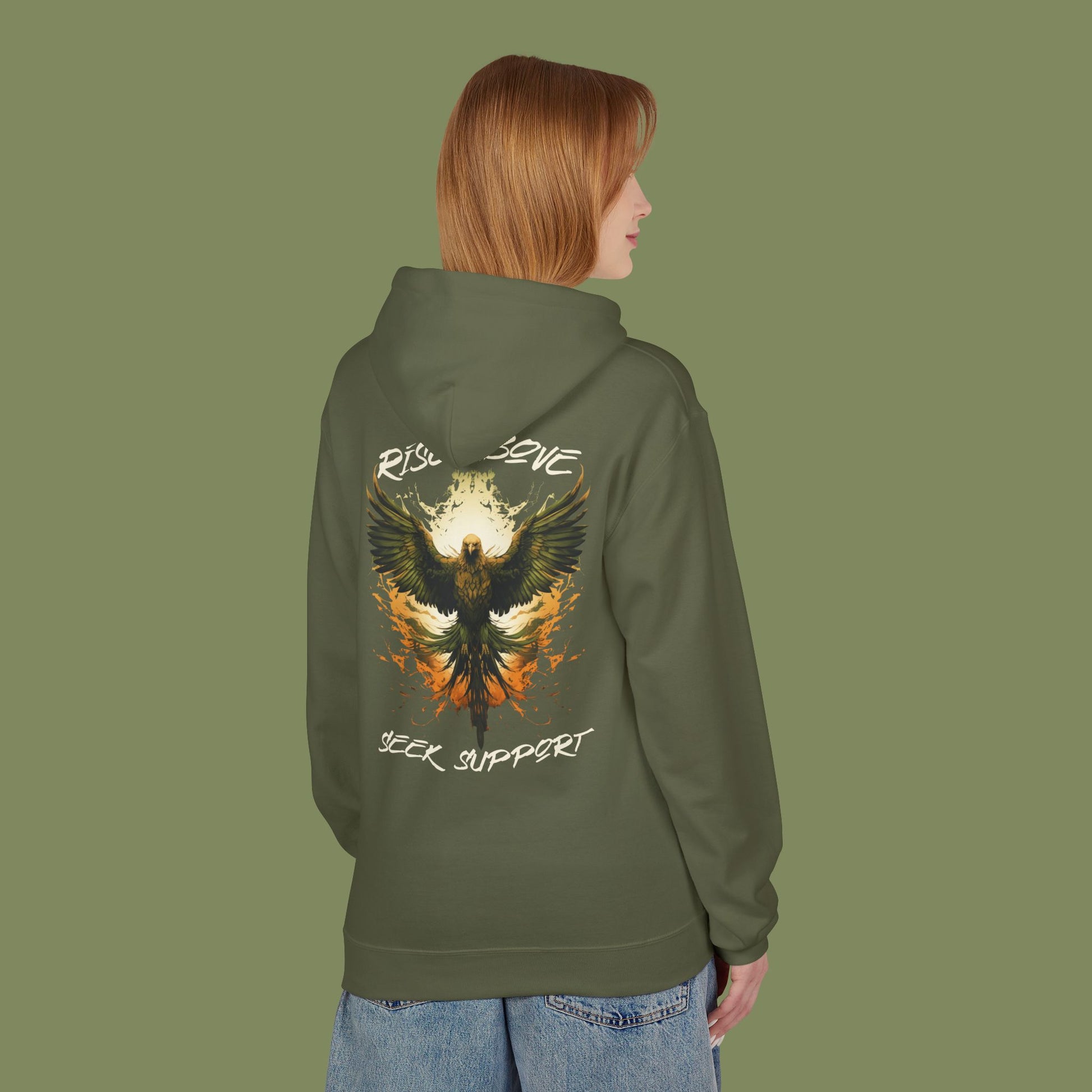 A Border Patrol Peer Support Hoodie for resiliency, featuring the Peer Support logo on the front and the rising phoenix from the fire on the back with the inscription 'Rise Above - Seek Support'. This hoodie exudes positivity and encouragement, making it perfect for individuals seeking support and motivation. Ideal for those in the field of peer support or anyone looking for a reminder to rise above challenges and seek help. Relevant for mental health awareness campaigns, peer support programs, and everyday wear.