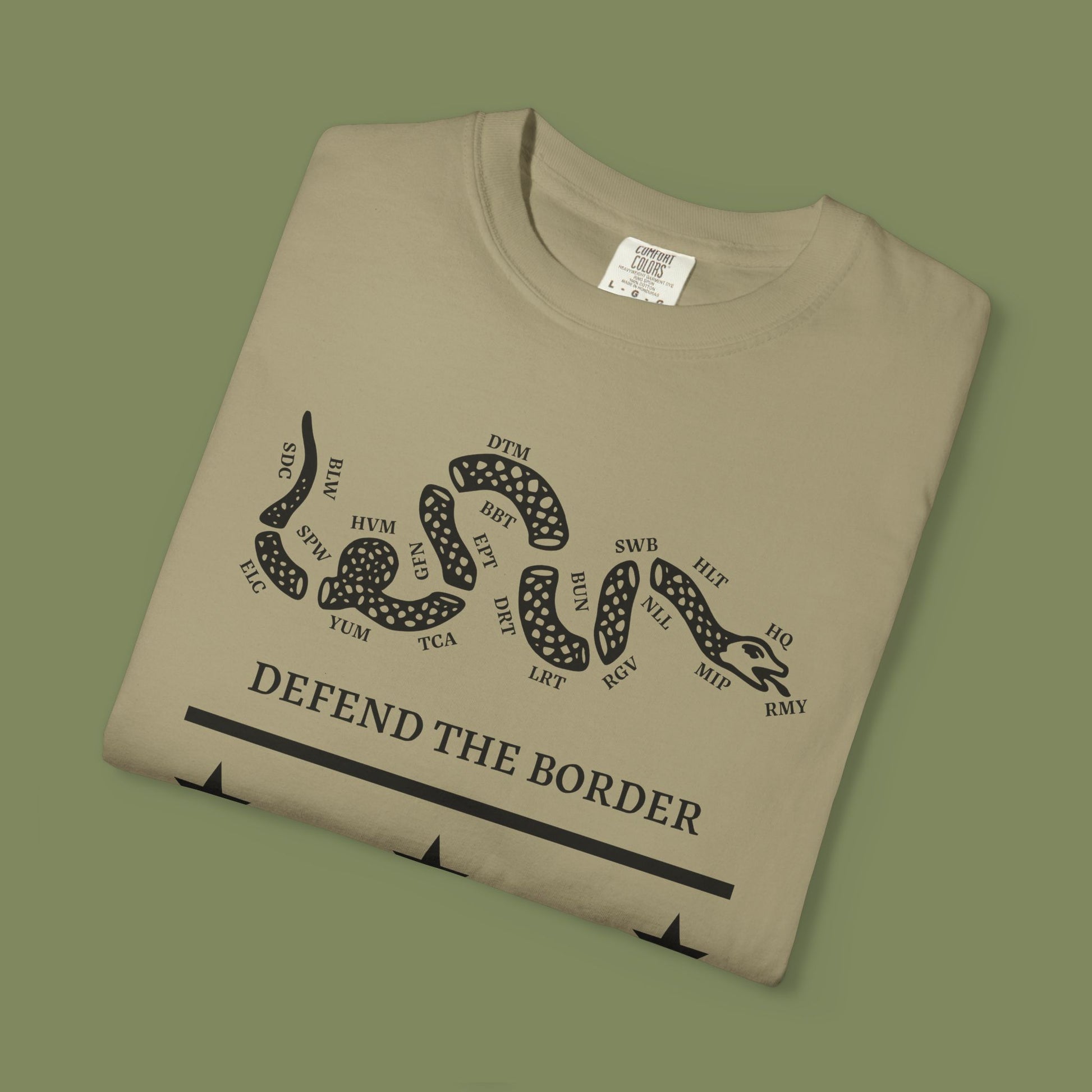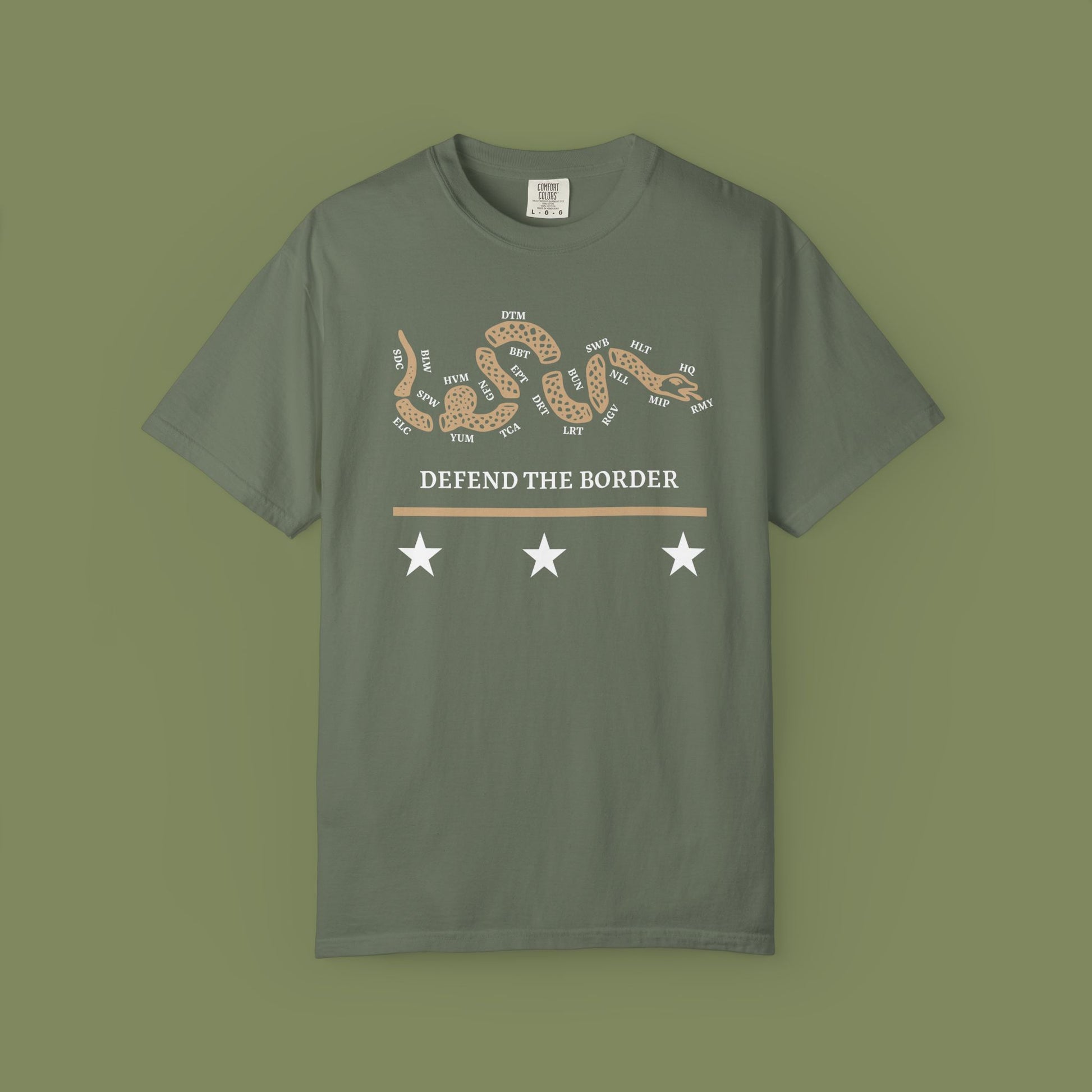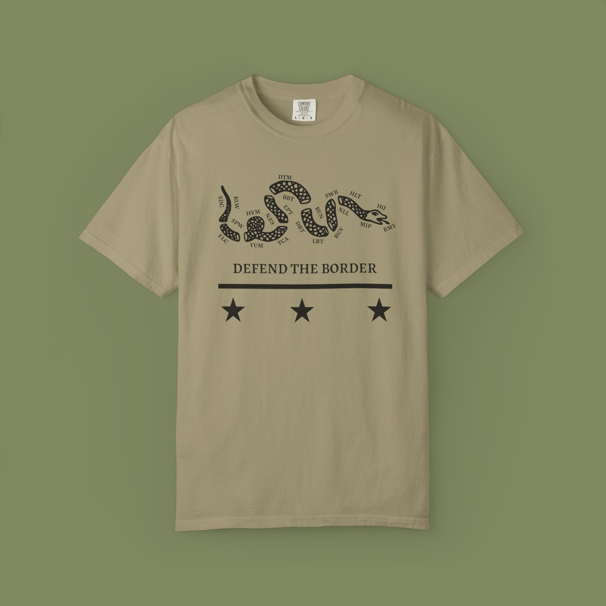 Introducing the "Defend the Border" Border Patrol T-shirt, a modern twist on a historic patriotic symbol, perfectly blending heritage with contemporary relevance. This unique t-shirt reinterprets the iconic segmented snake, traditionally used to represent unity and vigilance, to pay homage to the unified efforts of the Border Patrol sectors.