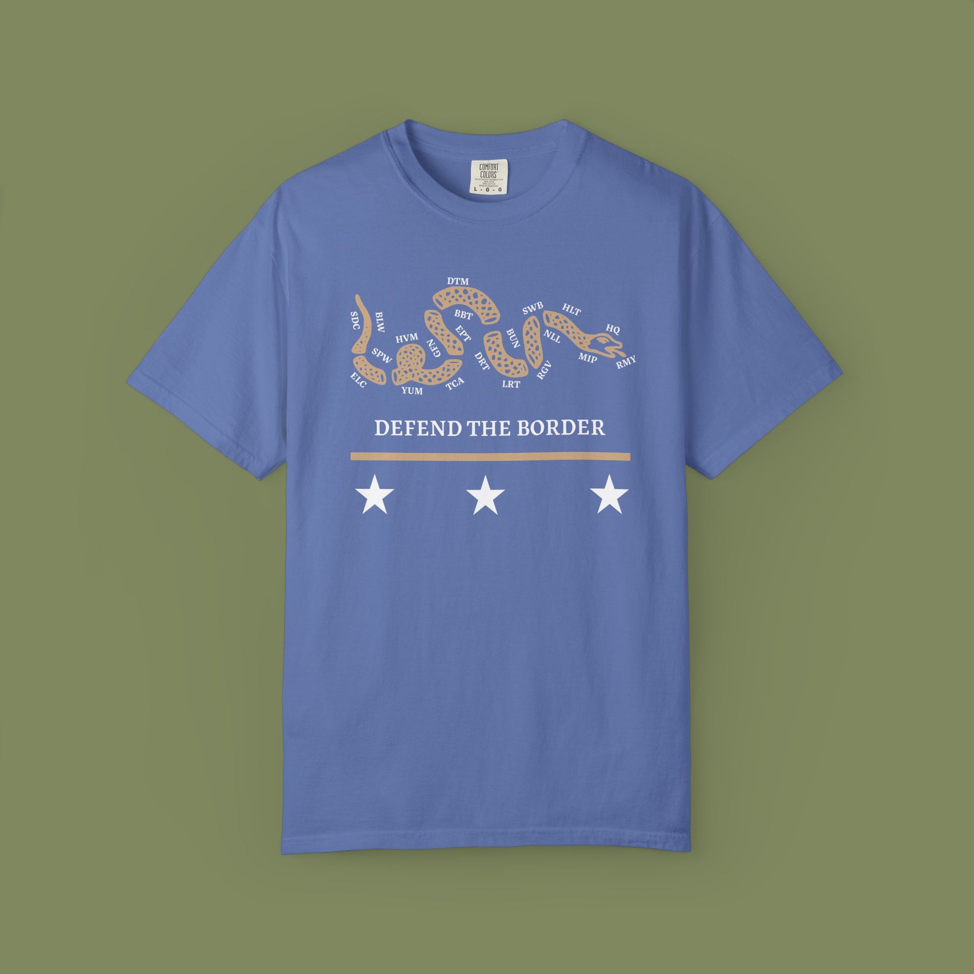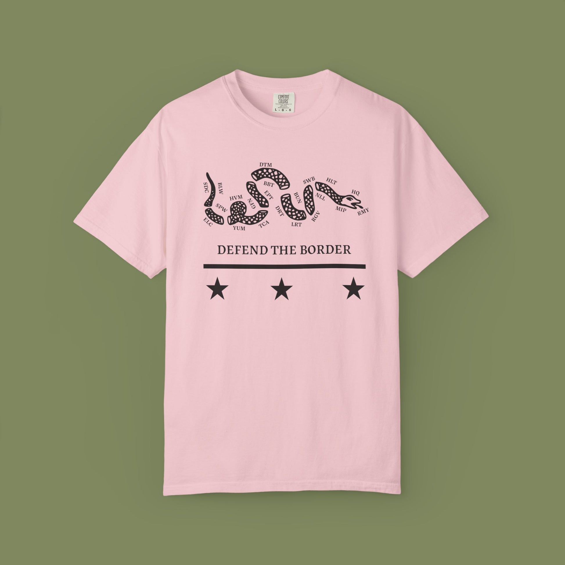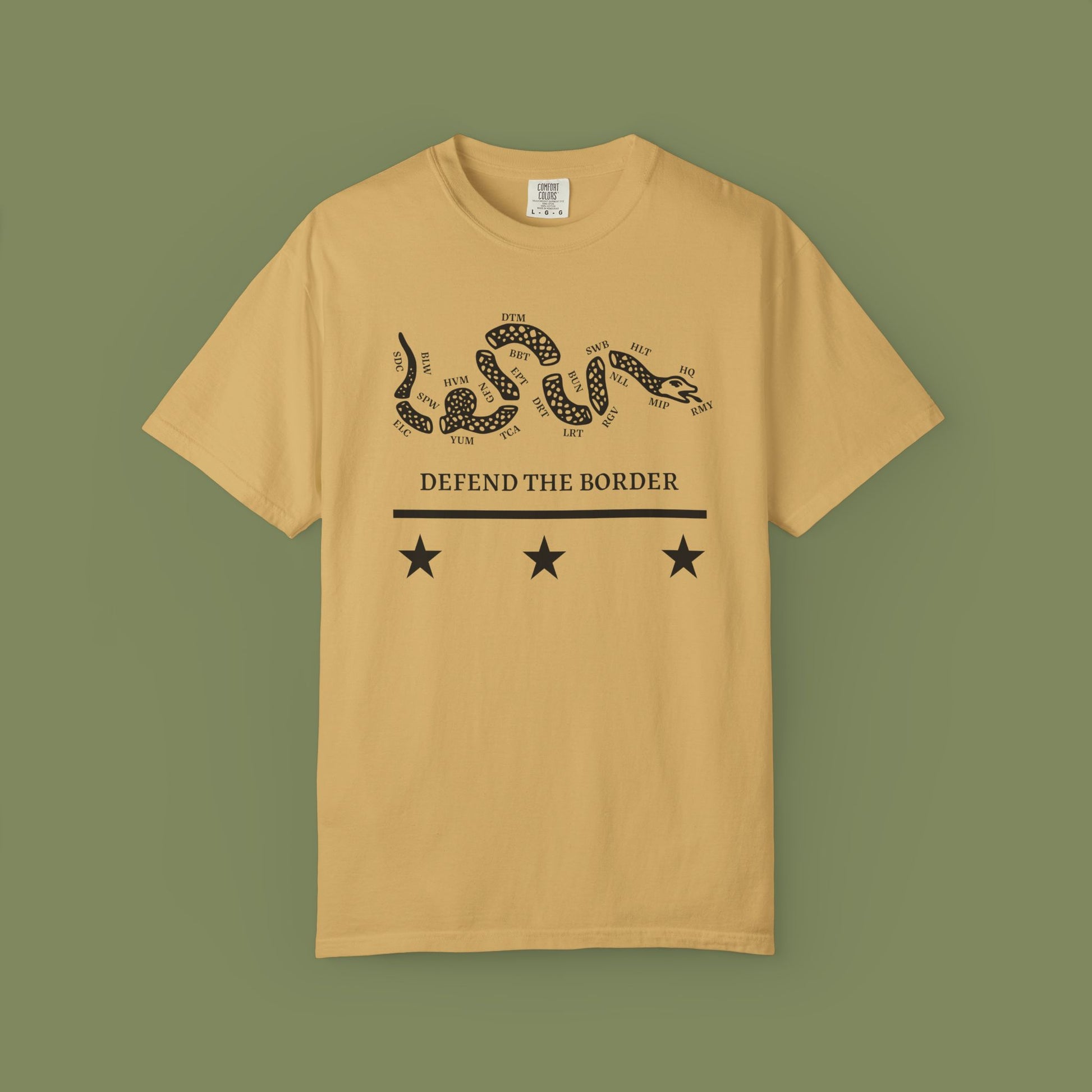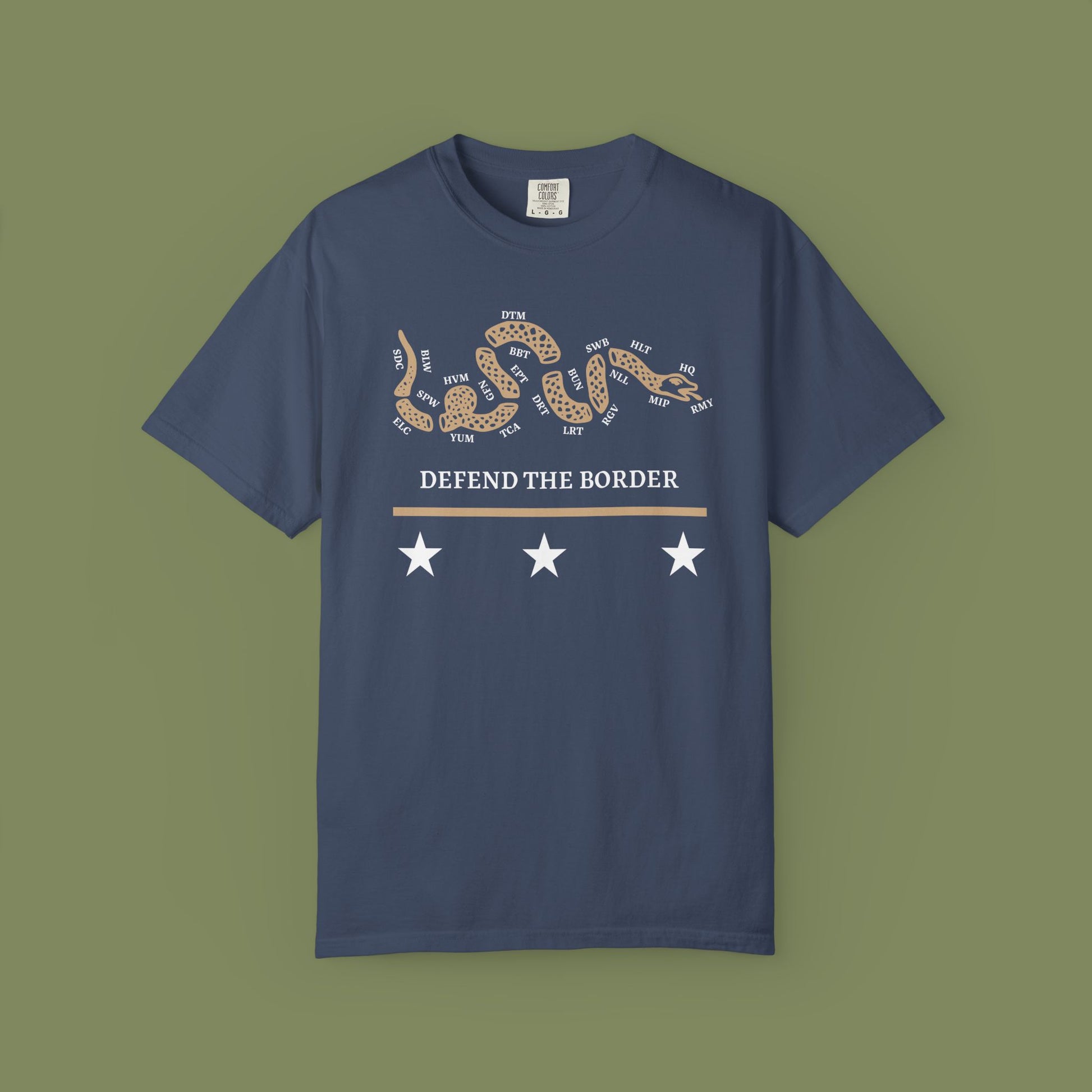 Introducing the "Defend the Border" Border Patrol T-shirt, a modern twist on a historic patriotic symbol, perfectly blending heritage with contemporary relevance. This unique t-shirt reinterprets the iconic segmented snake, traditionally used to represent unity and vigilance, to pay homage to the unified efforts of the Border Patrol sectors.
