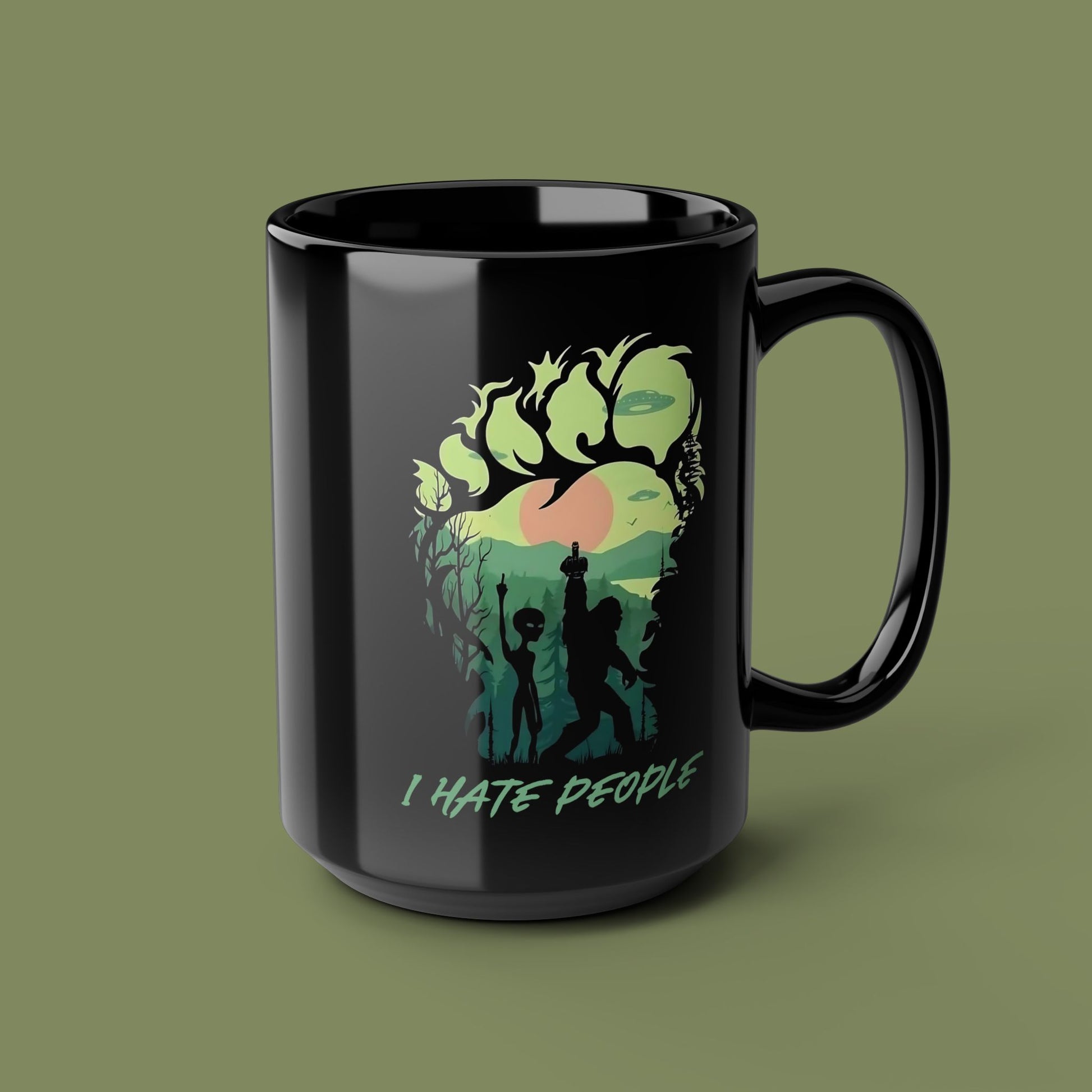 Start your mornings with a touch of humor and a whole lot of attitude with the "I Hate People" coffee mug by Vint Hill Designs. Featuring the hilarious and bold Bigfoot and alien duo flipping the bird, this mug is the perfect companion for anyone who prefers caffeine over conversations.