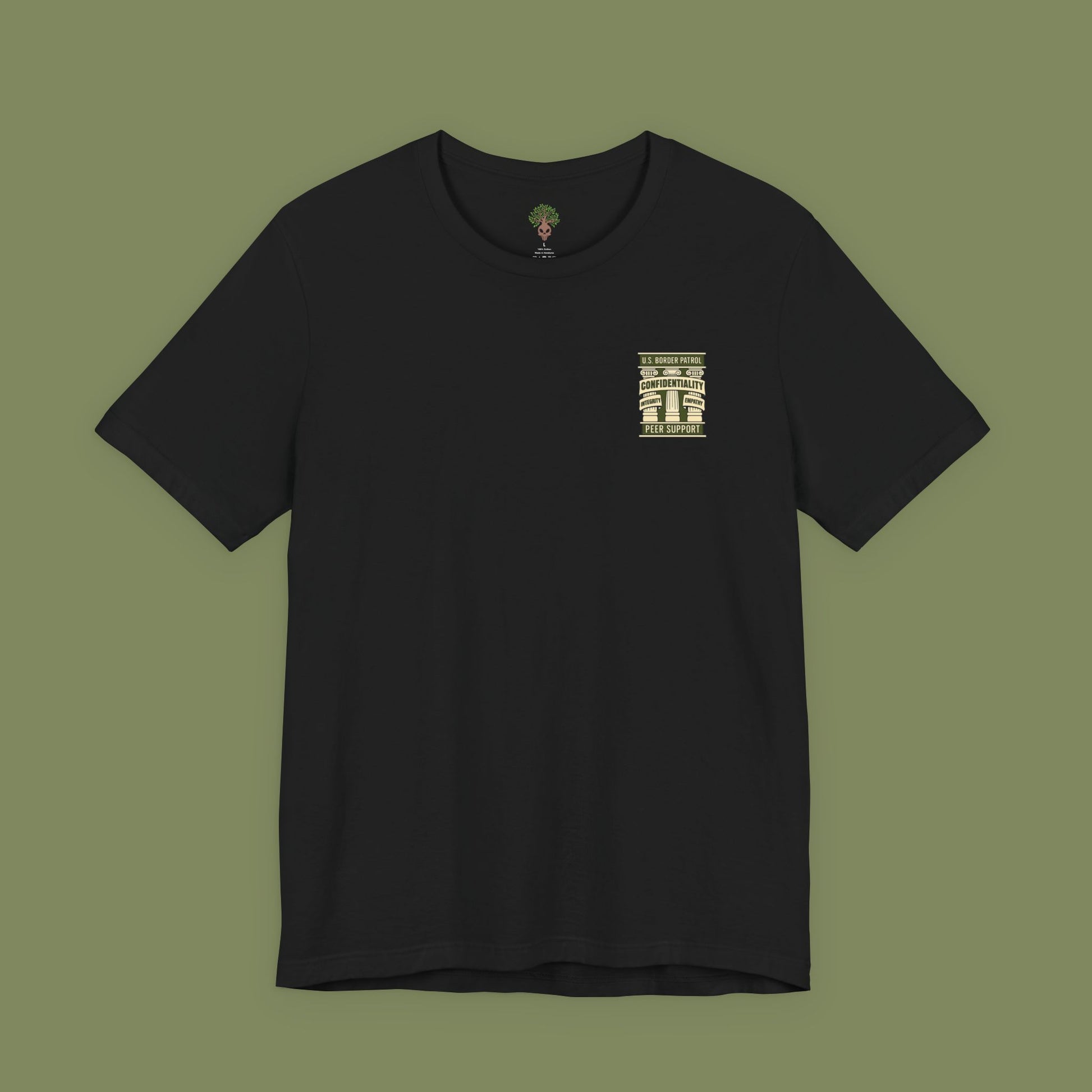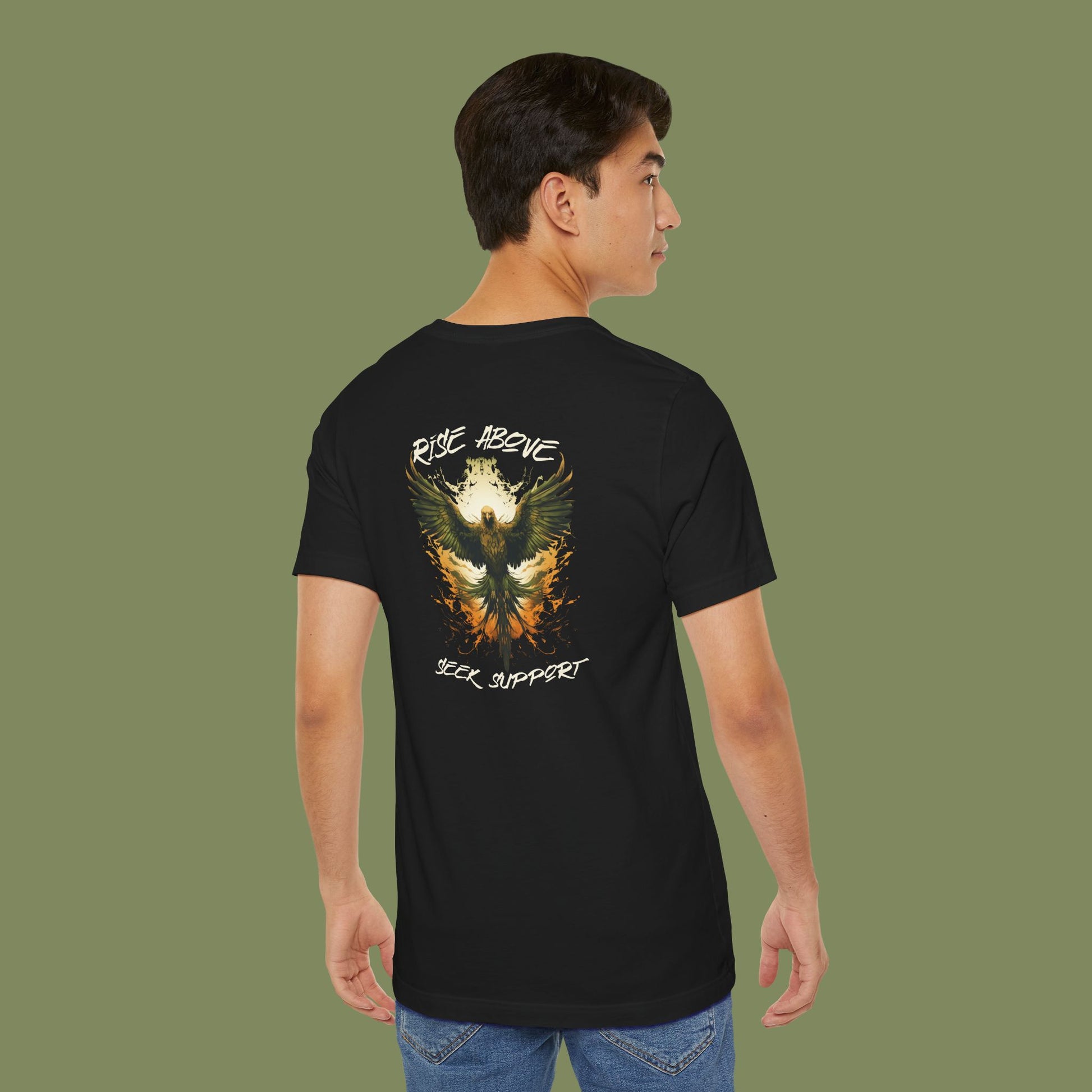 A unisex jersey short sleeve tee featuring a Border Patrol Peer Support design with a rising phoenix on the back symbolizing resilience. The inscription 'Seek Support' and 'Rise Above' adds motivation and empowerment. This t-shirt gives off a strong and supportive vibe, perfect for those who work in law enforcement or those passionate about mental health awareness. Ideal for wearing during volunteer events, mental health awareness campaigns, or as a thoughtful gift for a police officer or a mental health advocate.