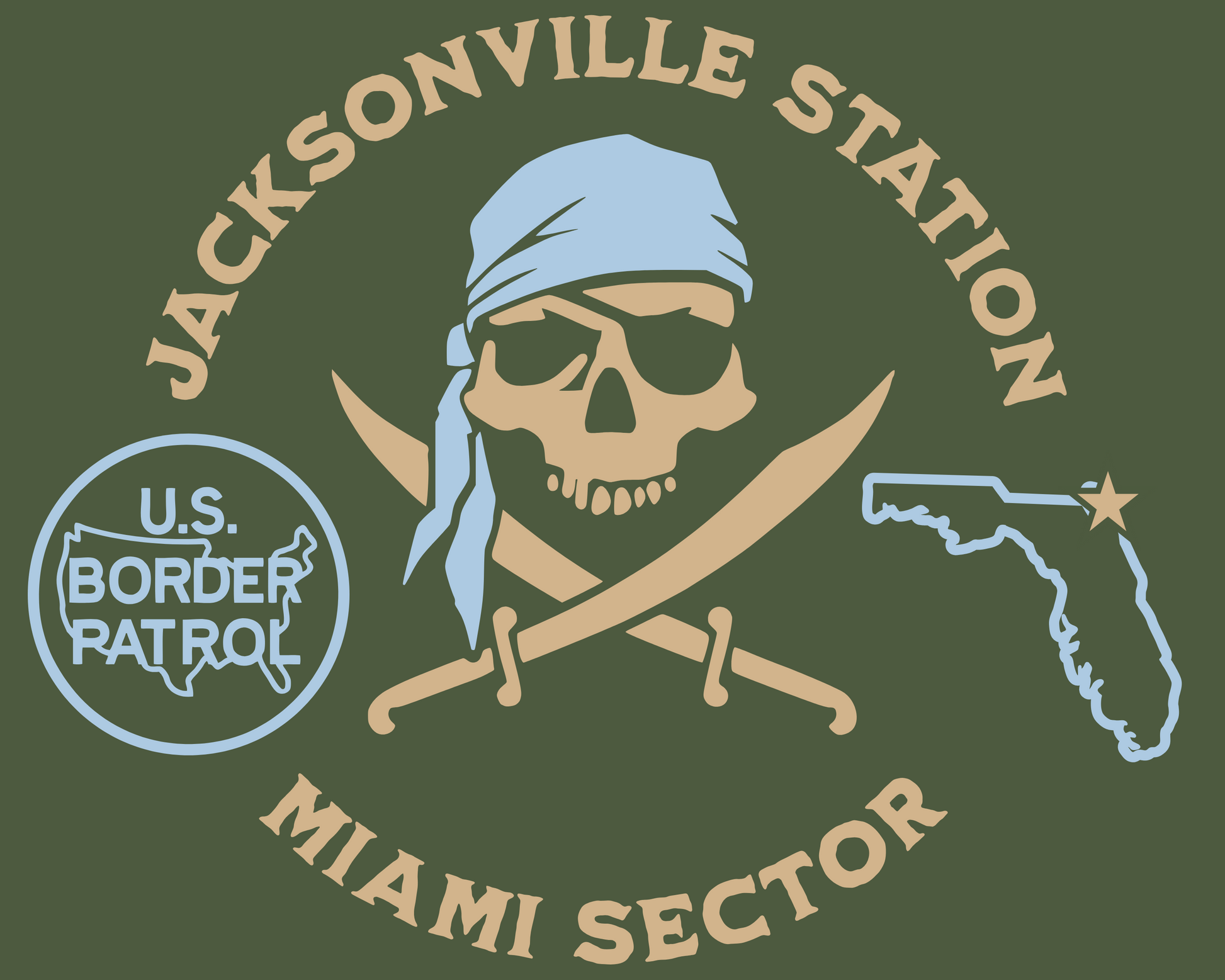Represent Jacksonville Station with a bold pirate-inspired edge. This design blends maritime grit with Border Patrol pride, featuring a skull-and-crossed-blades graphic, coastal coordinates, and Miami Sector heritage details.