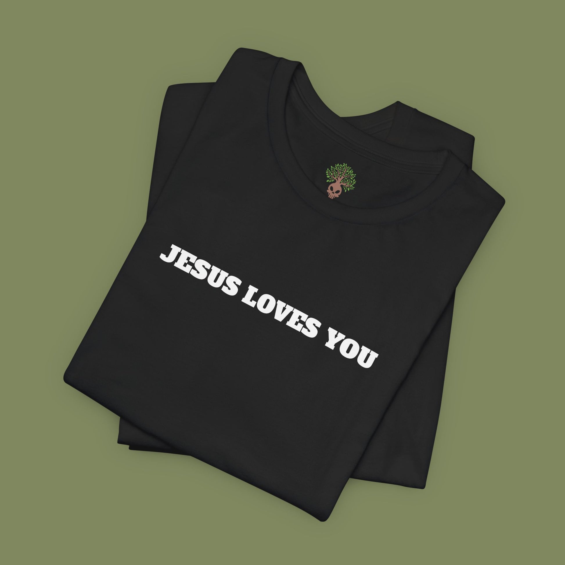 Stay comfortable and spread a positive message with this 'Jesus Loves You' T-shirt. Perfect for casual wear or as a conversation starter, this tee is ideal for religious individuals looking to express their faith. Great for Easter, Christmas, and everyday wear.